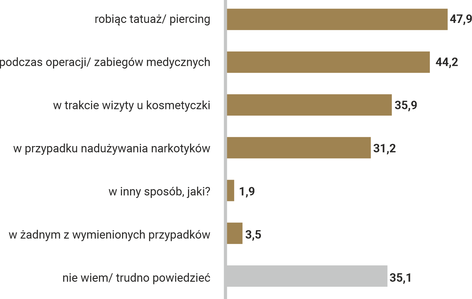 Uczestnicy badania pytani o to, gdzie można wykonać badanie anty-HCV, najczęściej wskazywali prywatną placówkę medyczną (38%). Co trzecia osoba uważa, że badanie można wykonać w poradni hepatologicznej, a jedynie niewiele ponad 30% wskazało na przychodnię POZ.
